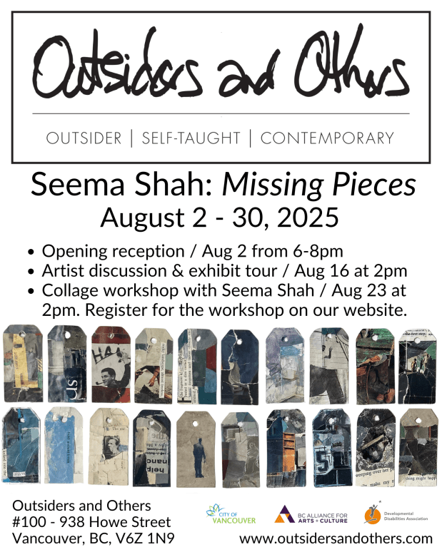Tag, You’re It. Again is a repeat of a workshop I facilitated in August 2025 in conjunction with my solo exhibition at Outsiders and Others. In this workshop, participants will create mini ‘self-portraits’ on shipping tags. Saturday, Sept 27 from 2-4 pm at at Outsiders and Others (#100 – 938 Howe St., Vancouver). Register here .