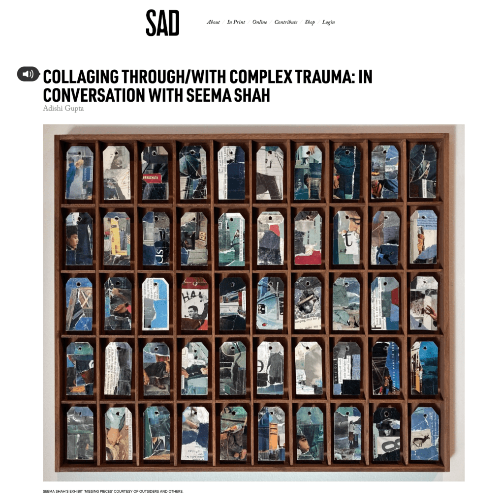 Very excited and appreciative to have an interview about my current solo exhibition at Outsiders and Others published in SAD Mag. A huge thank you to writer Adishi Gupta for her interest in my show and for her thoughtful questions and commentary about my work. You can read the interview here.