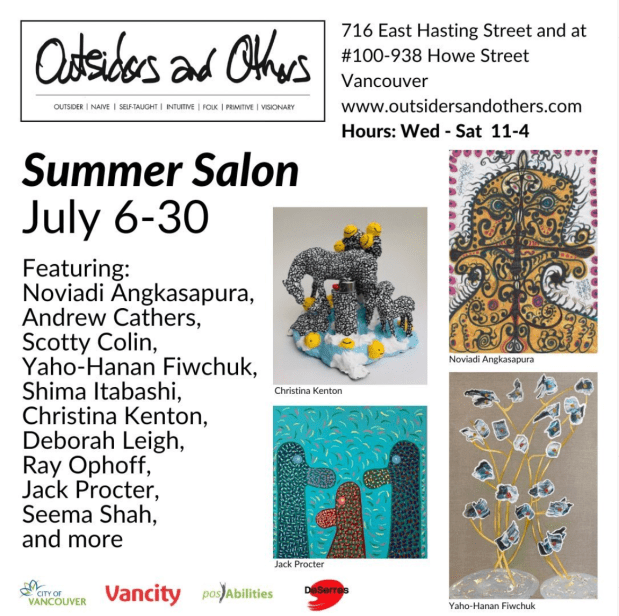 Summer Salon – July 6-30, 2022. Group exhibition at Outsiders and Others featuring work by artists shown previously at the gallery. The exhibition will take place in Outsiders and Others’ main / walk-in gallery at 716 East Hastings St. and window gallery at 938 Howe St. (Click bolded title to view entire exhibition online.)