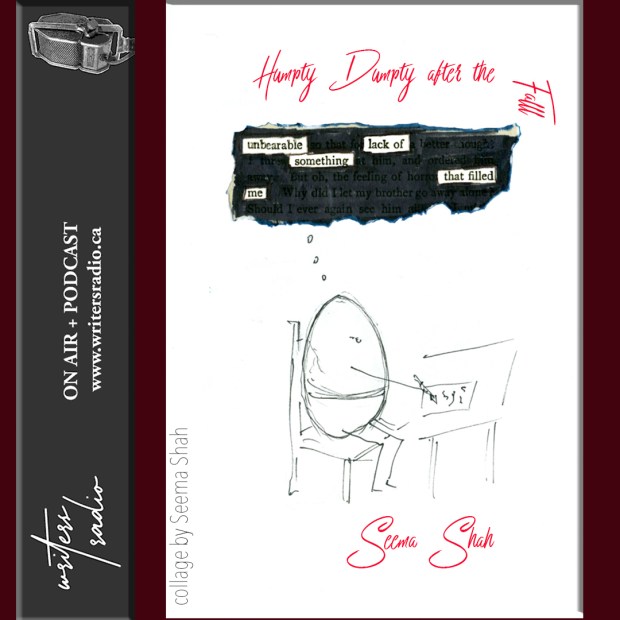Humpty Dumpty After the Fall (interview & readings) – Oct 30 – Nov 12, 2023 on Writers Radio (then archived in Writers Radio Podcasts Library). Episode features excerpts from my interview with Carole Harmon, as well as readings of prose and poetry. The readings include excerpts from a book I’m working on about Humpty Dumpty’s life after his fall.