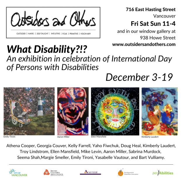 What Disability?!? – Dec 3-26, 2021. Group exhibition, Outsiders and Others. 716 East Hastings Street, Vancouver, BC. (Click bolded title to view entire exhibition online.)