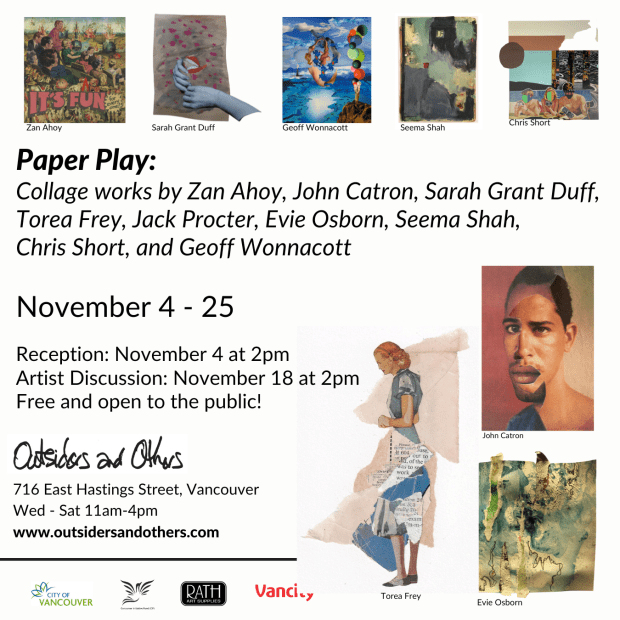 Paper Play – Nov 4-25, 2023. Group exhibition of collage artists at Outsiders and Others gallery in Vancouver, BC, 716 East Hastings St. (Click bolded title to view entire exhibition online.)